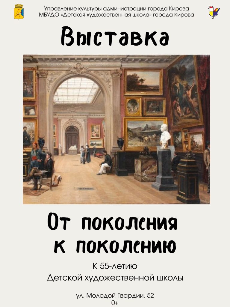 15 октября 2025 г. в выставочном зале начнет свою работу экспозиция художественных работ учащихся 1-5 классов, выпускников различных лет, педагогических работников «Детской художественной школы» являющихся действующими сотрудниками учреждения в различные периоды истории школы. Торжественный вечер и выставка посвящены 55-летию «Детской художественной школы» города Кирова и объединены общим названием и идеей «От поколения к поколению».